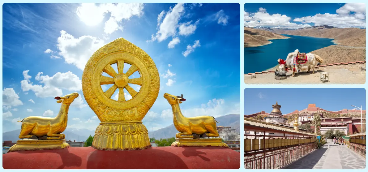 – Drive through high mountain passes, stopping at Yamdrok Lake for breathtaking views.